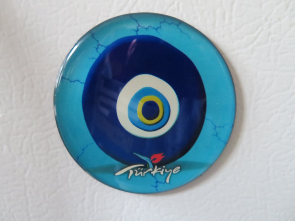 ‘Nazar Boncugu’ is Turkish for a blue bead used as a talisman to protect against the evil-eye. The evil-eye superstition comes from very early times and it can be found in most of the cultures in the world. This one is a magnet that we keep on our refrigerator. It makes me smile because it reminds me of my Turkish friends and all of the other ‘evil eye’ gadgets that I have acquired over the years (including a rope soap hanging in my shower!).