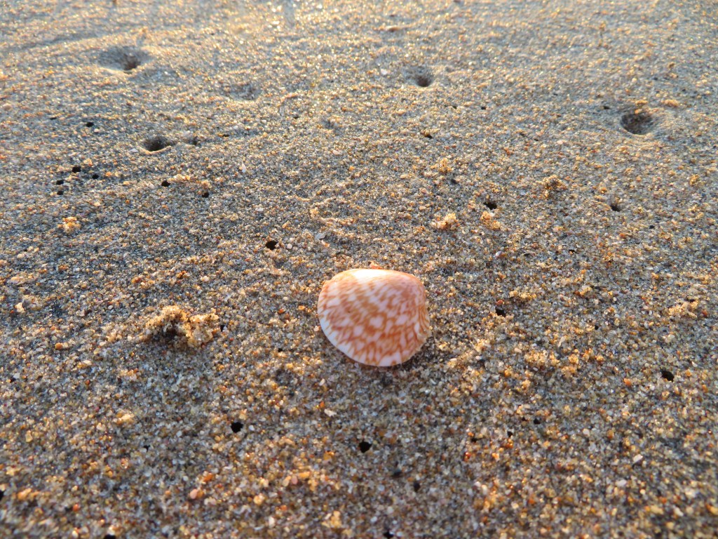 Doesn’t this just make you smile? Imagine walking along the beach just after sunrise and coming upon this lone shell on the sand – this beautiful, tigress-y shell, trying to blend in like a sand crab. Finding this little treasure, which now sits in our den in a dish with her new shell friends also from this same beach, filled my morning outing with joy.