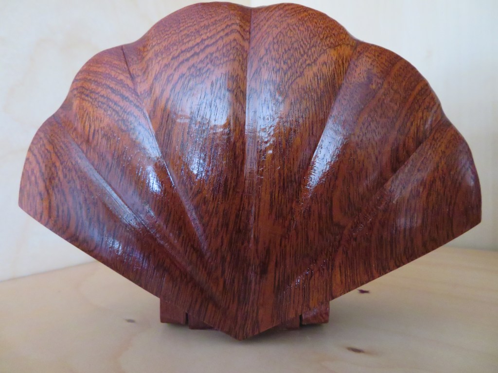This is another special gift that sits upon the shelves in my office. (Other things I’ve shared that hang out on my office bookshelves include the frog holding flowers vase, bite sized inspiration, positively packing, and a greener world.) It is from a colleague I worked with in Leadership Development at IBM named Melanie. She is an energetic and brilliant young professional who was creating experiences for the best of our managers. She is also one of the kindest, gentlest beings I’ve met. Catch this – at HER going away party SHE gave each of us a hand-made gift with a personalized note card. What you see here is the 5″ wide hinged wooden box shaped like a scallop shell that her Dad made. Precious, no?